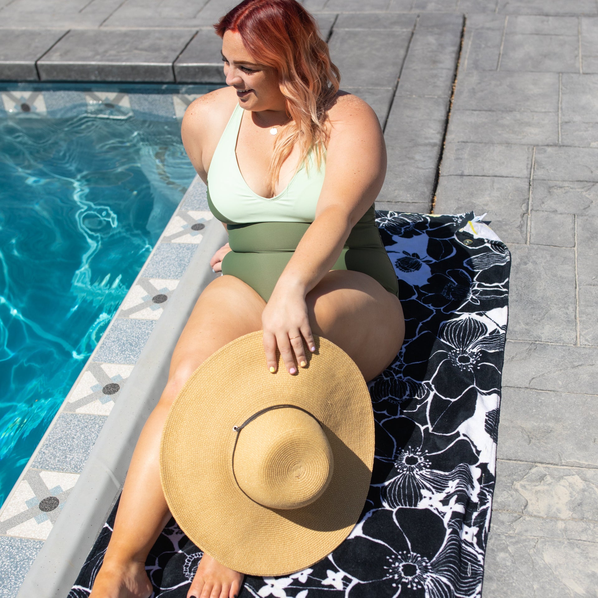 Our Poppy Noir print is one of our most popular patterns! This pattern is inspired by the delicate charm of poppy flowers, reimagined in a striking black and white palette. The back of the towel print is a sunny yellow floral print and the two custom-designed buttons are shiny gold.