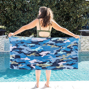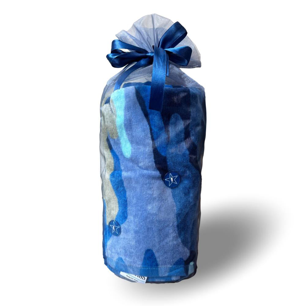 This gender neutral camo print features shades of blue with touches of tan and lavender. The back of the towel print is blue with white stars.
