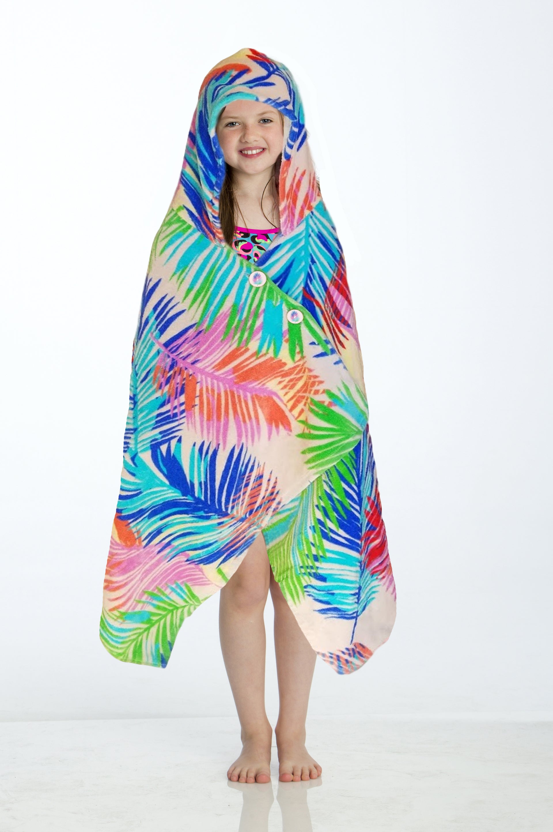 Vibrant colors on a blush pink background make this a versatile styling cover up to coordinate with all their swimsuits. This multi-colored palm print was inspired by one of our favorite Florida islands - Key West - and their colorful buildings and palm trees.