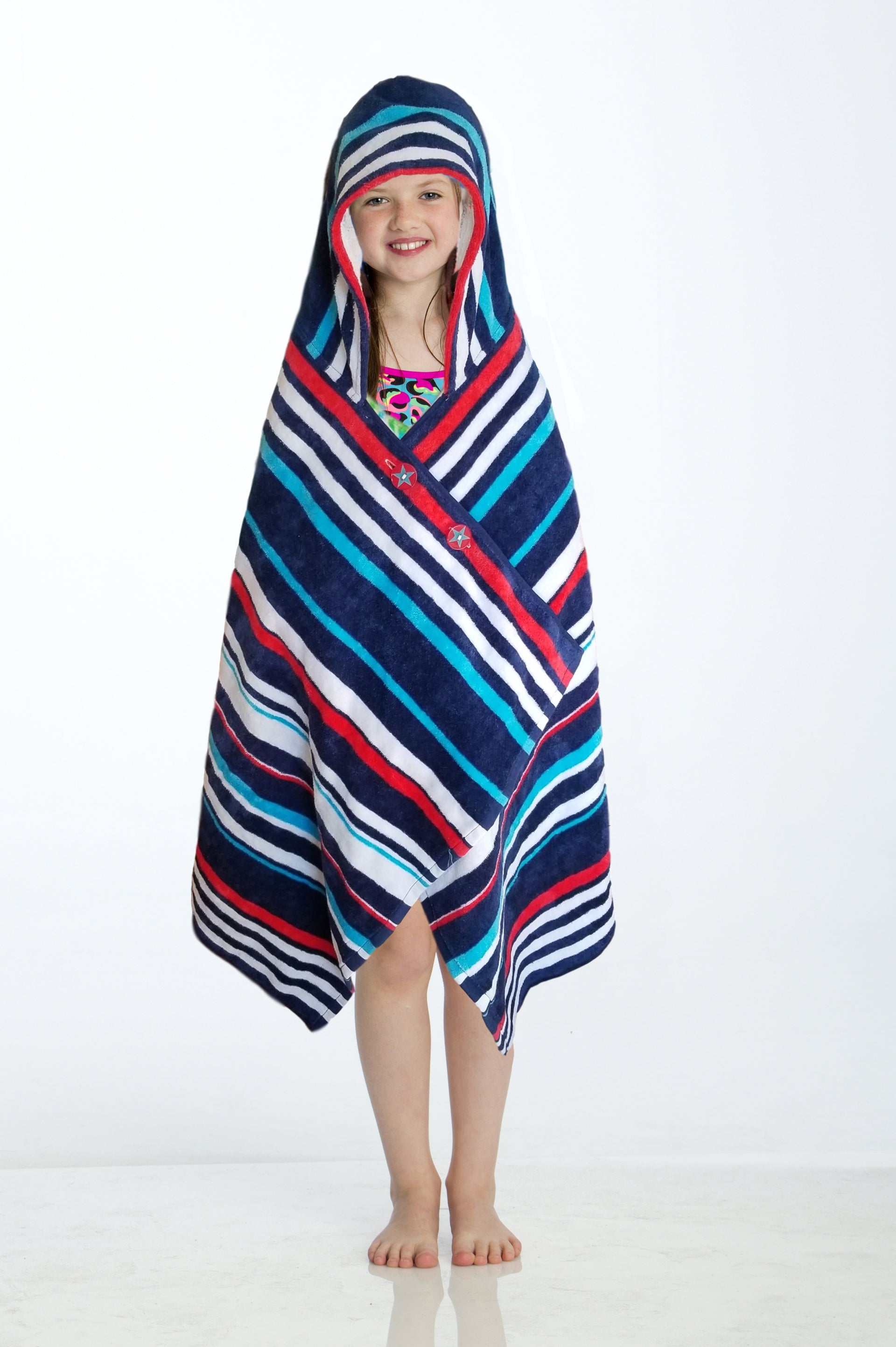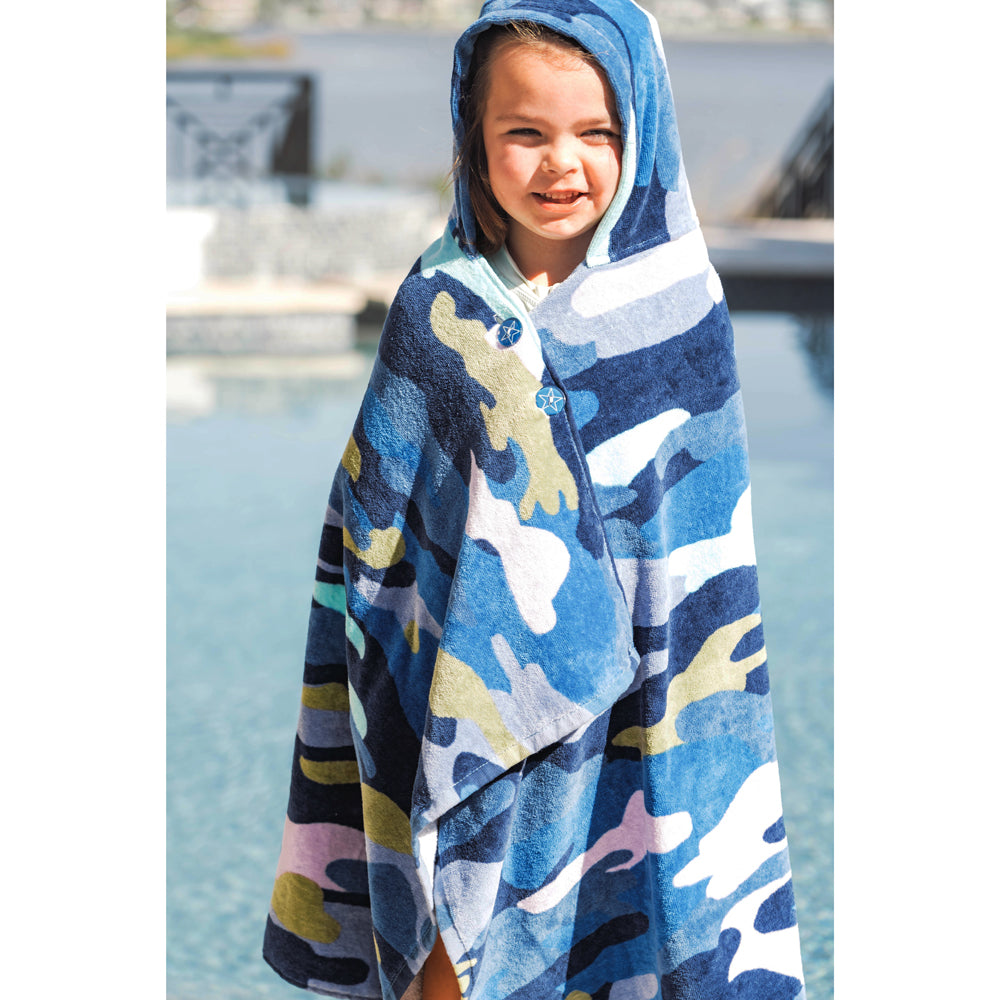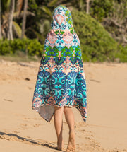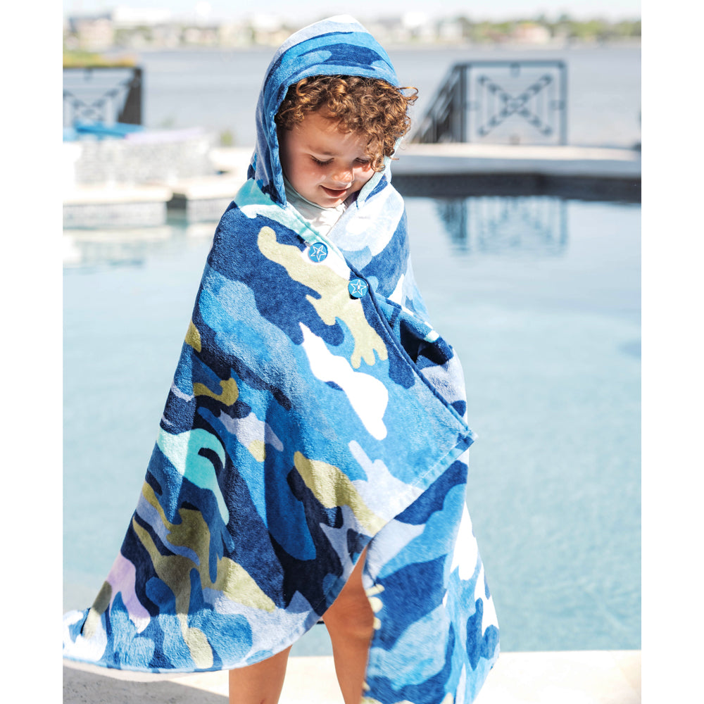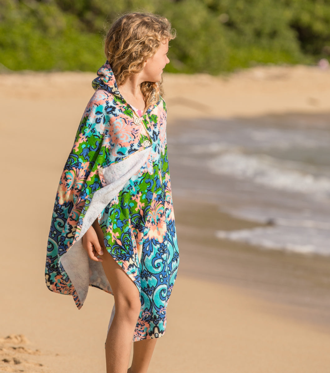 A towel that stays put! This cozy, hooded towel has clever buttons that allow kids to dry off, wrap and stay put! Little ones can now stay warm on the boat or after the pool and get dry fast - all while freeing up their parents’ hands. The hood can be worn up or down and the wrap stays securely around their shoulders with custom-designed, colorful buttons. Great for kids to wear on their own or as a set with the Cotton Towel Sarong matching ‘Mommy & Me’ look!