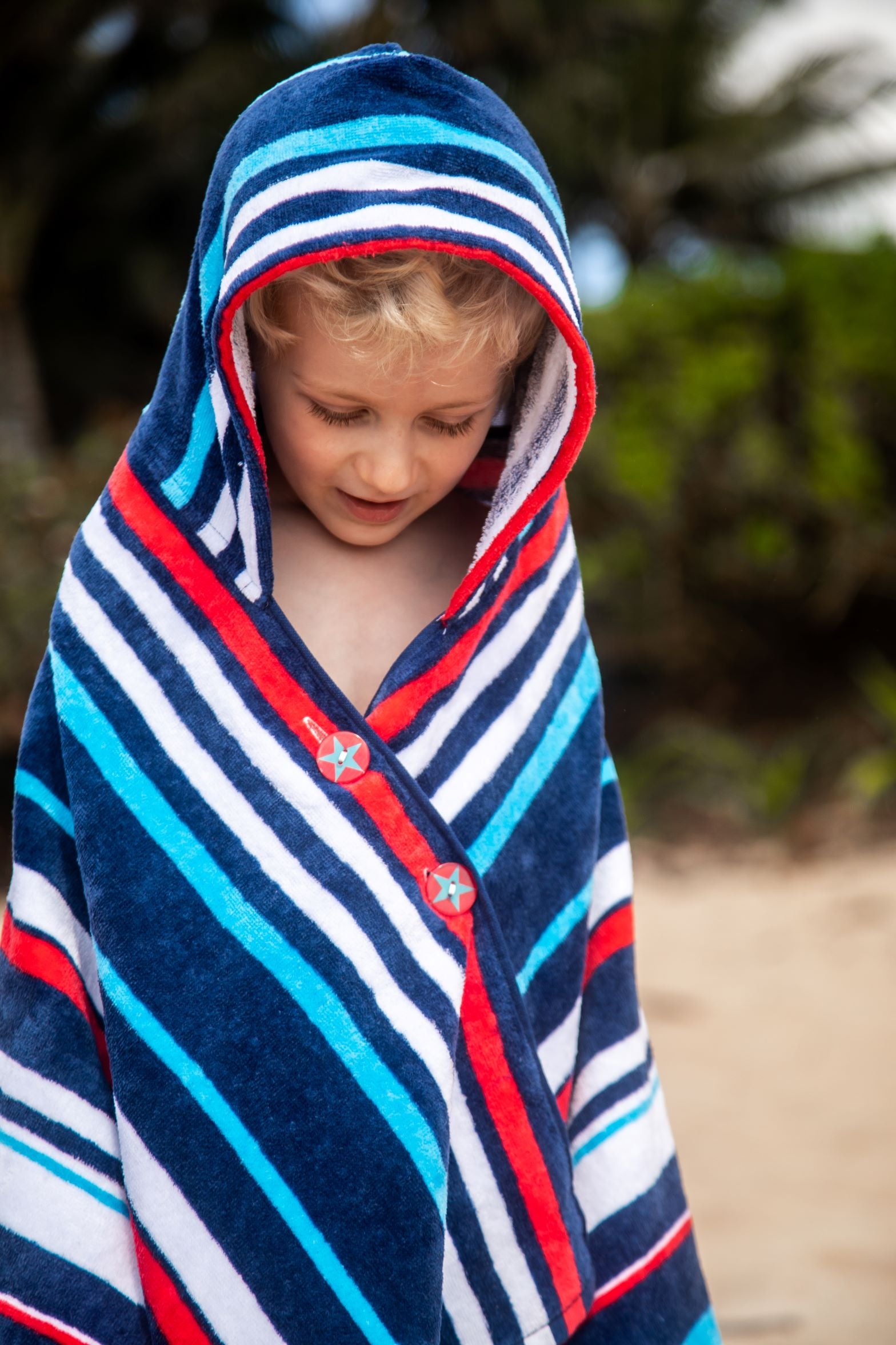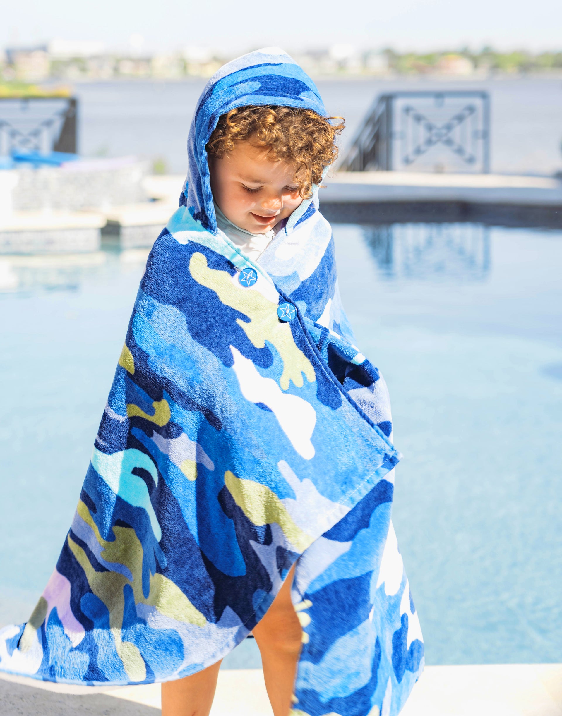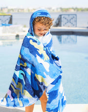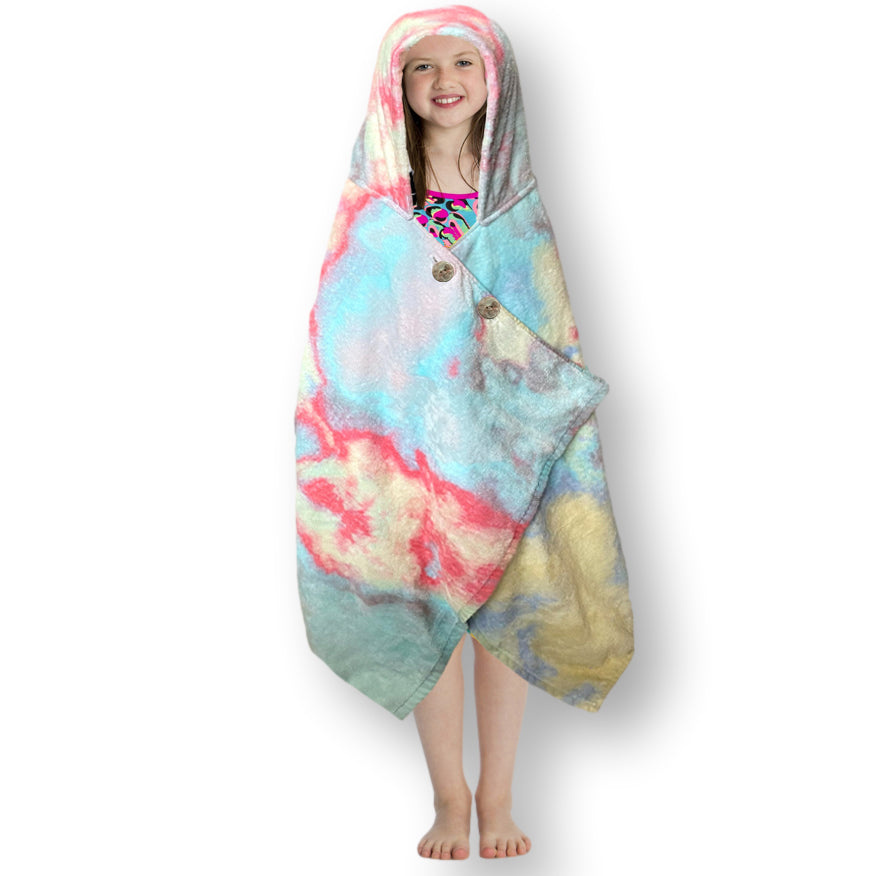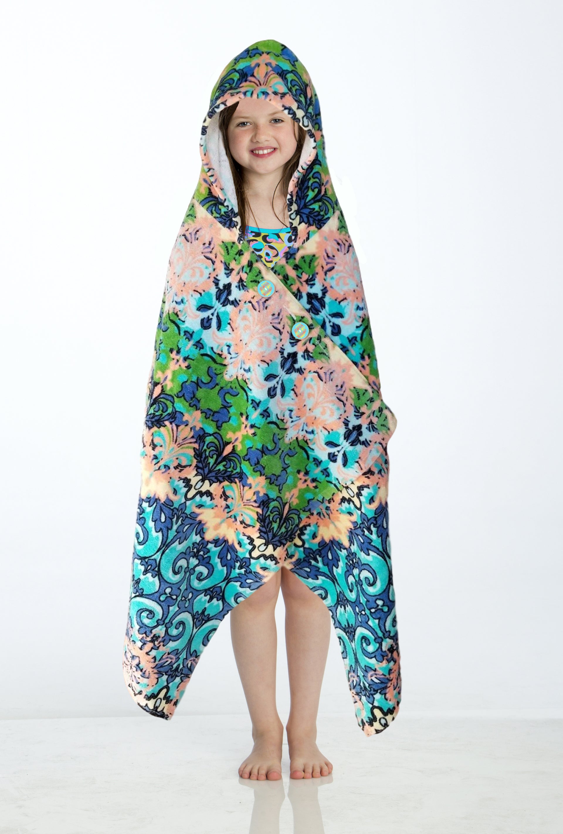 A towel that stays put! This cozy, hooded towel has clever buttons that allow kids to dry off, wrap and stay put! Little ones can now stay warm on the boat or after the pool and get dry fast - all while freeing up their parents’ hands. The hood can be worn up or down and the wrap stays securely around their shoulders with custom-designed, colorful buttons. Great for kids to wear on their own or as a set with the Cotton Towel Sarong matching ‘Mommy & Me’ look!