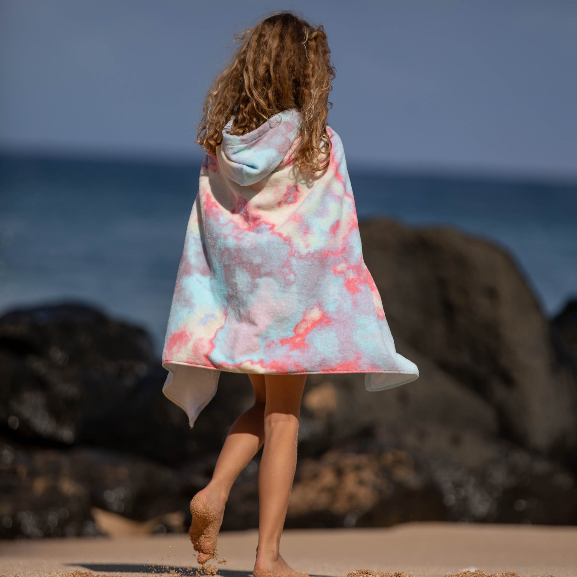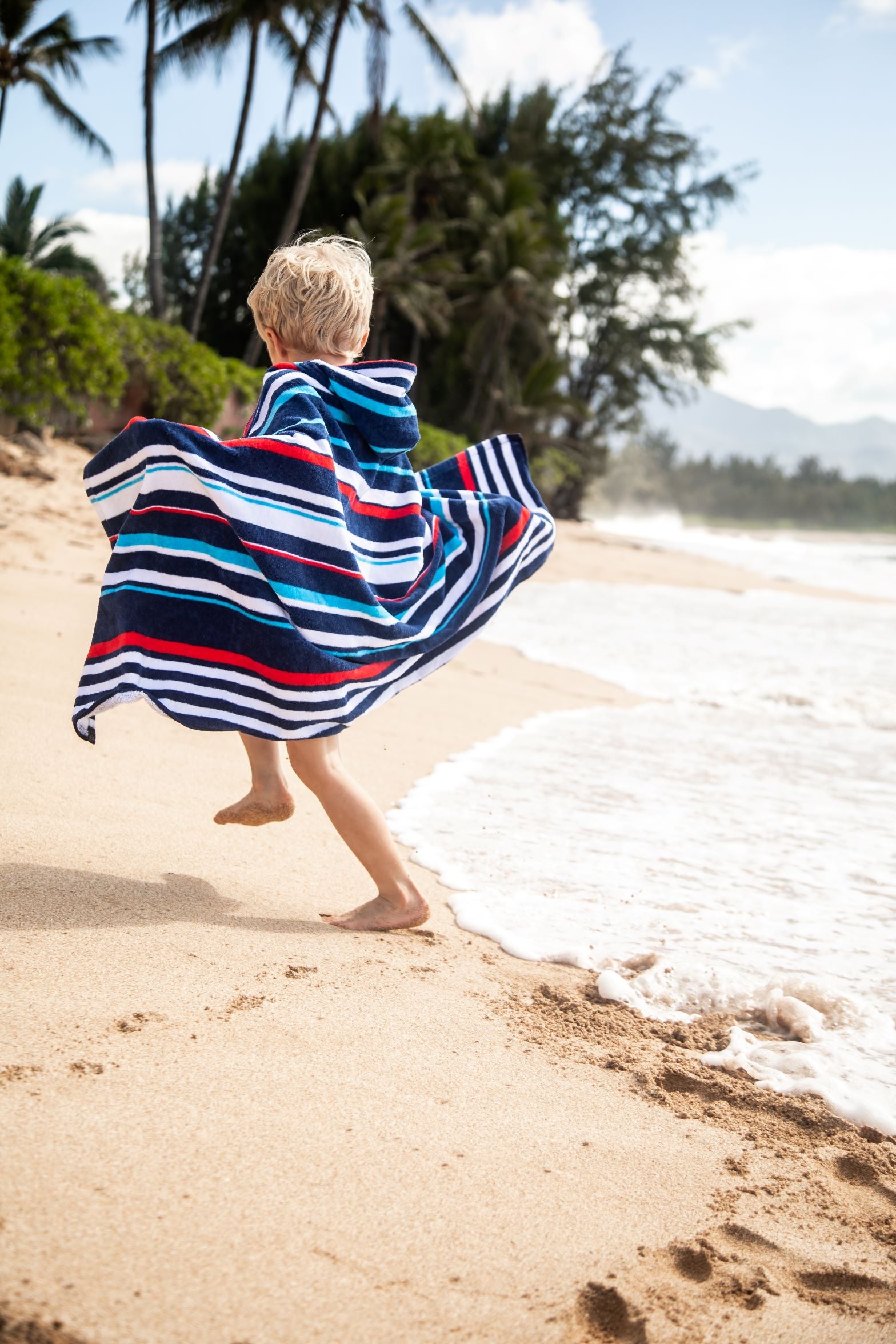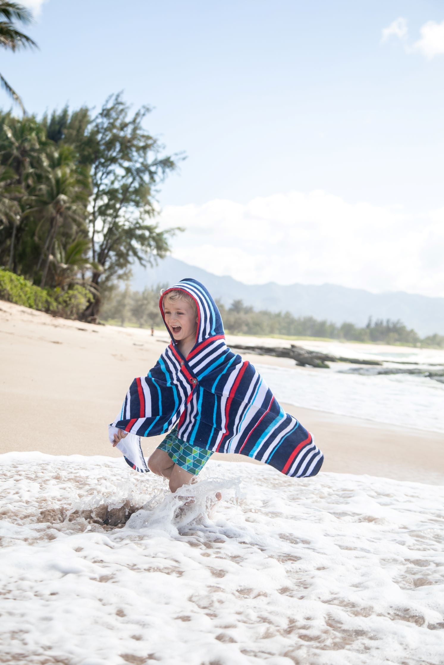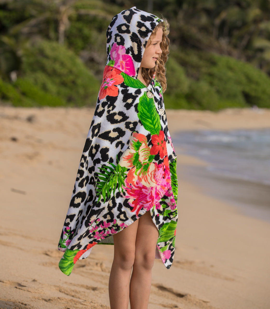 A towel that stays put! This cozy, hooded towel has clever buttons that allow kids to dry off, wrap and stay put! Little ones can now stay warm on the boat or after the pool and get dry fast - all while freeing up their parents’ hands. The hood can be worn up or down and the wrap stays securely around their shoulders with custom-designed, colorful buttons. Great for kids to wear on their own or as a set with the Cotton Towel Sarong matching ‘Mommy & Me’ look!