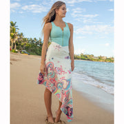 After a fun day at the beach, add this sarong and you're ready for the perfect sunset.  All the colors of a beach sunset are brought to life for this cascading paisley print on an ivory background.  Reverses to a solid heather teal on the back.